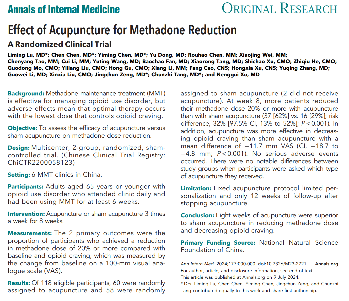 阿片类药物成瘾属全球严峻的公共卫生问题。7月9日,国际顶级医学期刊《内科学年鉴》(Annals of Internal Medicine)发表了广州中医药大学许能贵教授团队针刺干预药物成瘾研究的最新原创研究成果——针刺干预美沙酮减量的随机对照试验。研究表明,在接受了靳三针规范治疗后,受治者使用美沙酮维持剂量和阿片类药物渴求显著降低。这一研究成果还有望纳入临床戒毒的国际指南。