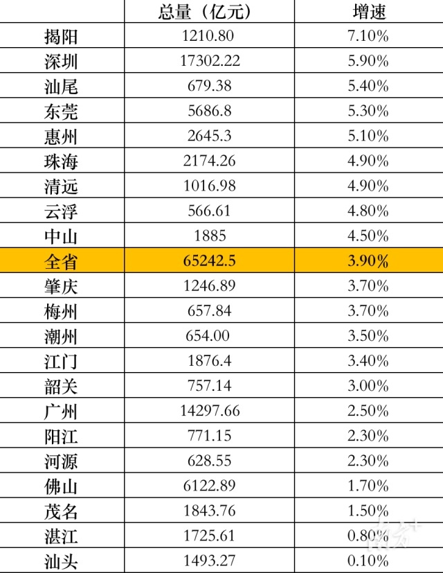 增速方面,揭阳、深圳、汕尾分别以7.10%、5.90%、5.40%的增速领跑全省。揭阳、深圳、汕尾、东莞、惠州、珠海、清远、云浮、中山9市GDP增速高于全省(3.9%)。其中,珠三角地区占5席、粤东粤西粤北地区占4席。